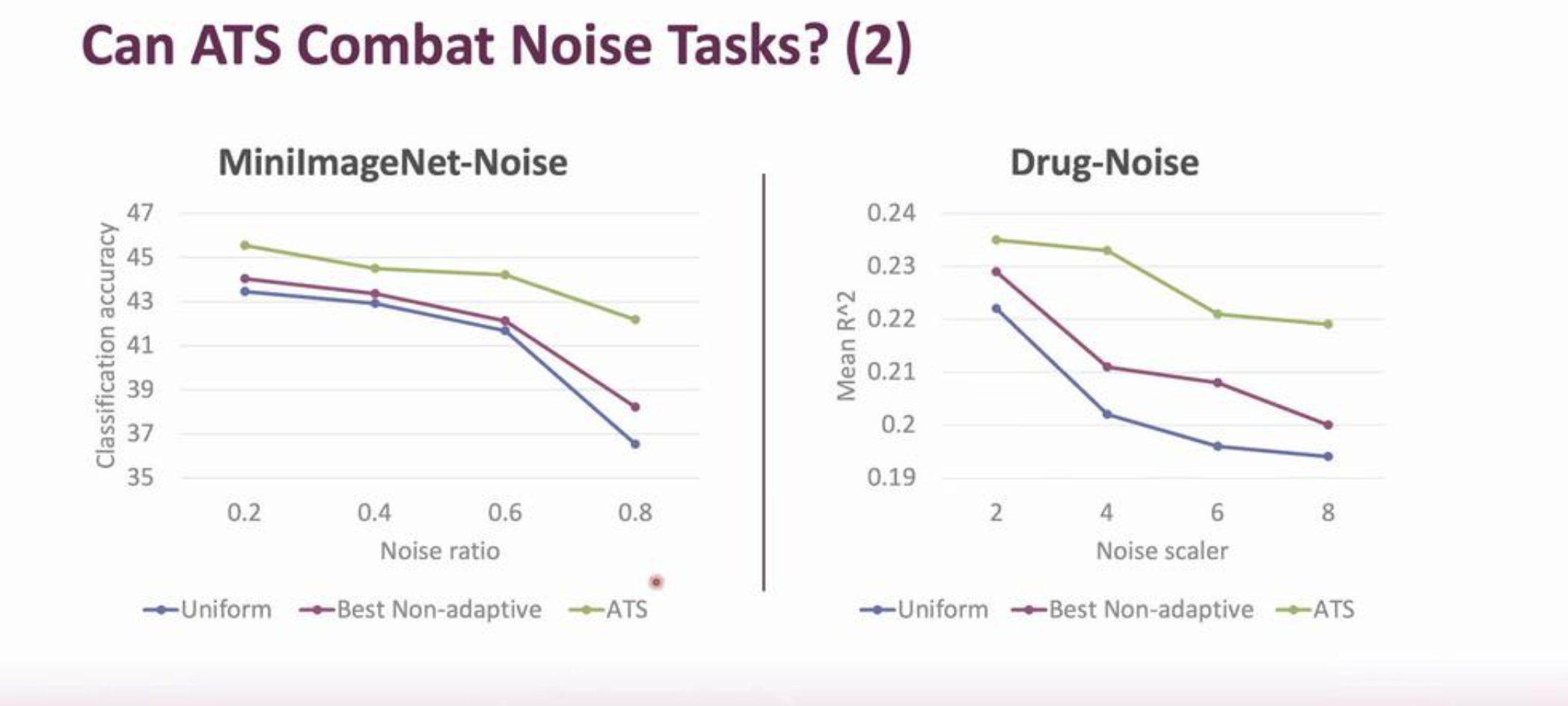 - ATS consistently improves the generalization under noisy settings in different applications, better than 1) non-adaptive data schedulers, 2) non-adaptive task schedulers. See figure below.